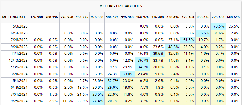 Swapy OIS wyceniają blisko 73,5% szans na utrzymanie stóp na posiedzeniu FOMC w maju oraz 65,5% szans na obcięcie stóp o 25 pb na kolejnym posiedzeniu w czerwcu. Źródło: CME