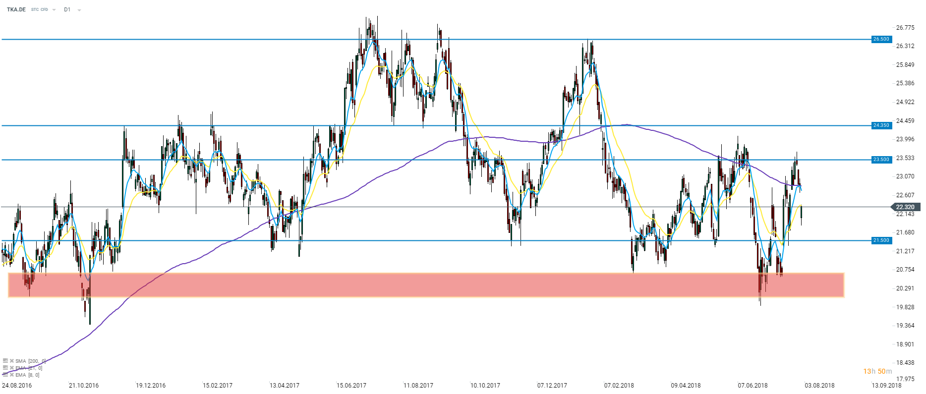 Thyssenkrupp (TKA.DE) jest dziś jednym z najgorszych komponentów z indeksu DAX. Firma ostrzegła, że jej zyski mogą być w rzeczywistości bliższe niższych z wcześniejszych szacunków. Niemiecki koncern wskazał na spowolnienie sprzedaży w jednostce przemysłowej, jak również wyższe koszty. Te ostrzeżenie pojawiają się w obliczu presji niektórych inwestorów na restrukturyzację firmy, obwiniając zbyt złożoną strukturę za słabe wyniki finansowe. Przypomnijmy, że presja ze strony inwestorów spowodowała rezygnację prezesa. Firma pokaże swoje wyniki 9 sierpnia. Po pierwszej godzinie handlu kapitalizacja Thyssenkrupp spadła o prawie 2,3%.