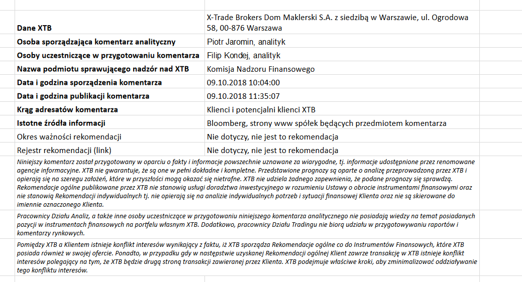Ta publikacja handlowa jest informacyjna i edukacyjna. Nie jest rekomendacją inwestycyjną ani informacją rekomendującą lub sugerującą strategię inwestycyjną. W materiale nie sugerujemy żadnej strategii inwestycyjnej ani nie świadczymy usługi doradztwa inwestycyjnego. Materiał nie uwzględnia indywidualnej sytuacji finansowej, potrzeb i celów inwestycyjnych klienta. Nie jest też ofertą sprzedaży ani subskrypcji. Nie jest zaproszeniem do nabycia, reklamą ani promocją jakichkolwiek instrumentów finansowych. Publikację handlową przygotowaliśmy starannie i obiektywnie. Przedstawiamy stan faktyczny znany autorom w chwili tworzenia dokumentu. Nie umieszczamy w nim żadnych elementów oceniających. Informacje i badania oparte na historycznych danych lub wynikach oraz prognozy nie stanowią pewnego wskaźnika na przyszłość. Nie odpowiadamy za Twoje działania lub zaniechania, zwłaszcza za to, że zdecydujesz się nabyć lub zbyć instrumenty finansowe na podstawie informacji z tej publikacji handlowej. Nie odpowiadamy też za szkody, które mogą wynikać z bezpośredniego czy też pośredniego wykorzystania tych informacji. Inwestowanie jest ryzykowne. Inwestuj odpowiedzialnie.