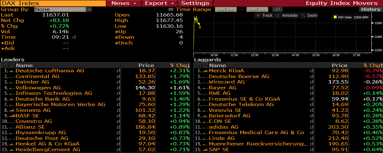 26 z 30 walorów notowanych w niemieckim DE30 rośnie o poranku, podczas gdy pozostałe 4 komponenty notowane są z niewielkimi stratami. Źródło: Bloomberg.