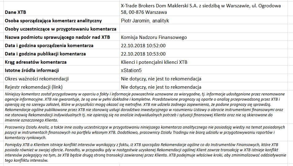 Ta publikacja handlowa jest informacyjna i edukacyjna. Nie jest rekomendacją inwestycyjną ani informacją rekomendującą lub sugerującą strategię inwestycyjną. W materiale nie sugerujemy żadnej strategii inwestycyjnej ani nie świadczymy usługi doradztwa inwestycyjnego. Materiał nie uwzględnia indywidualnej sytuacji finansowej, potrzeb i celów inwestycyjnych klienta. Nie jest też ofertą sprzedaży ani subskrypcji. Nie jest zaproszeniem do nabycia, reklamą ani promocją jakichkolwiek instrumentów finansowych. Publikację handlową przygotowaliśmy starannie i obiektywnie. Przedstawiamy stan faktyczny znany autorom w chwili tworzenia dokumentu. Nie umieszczamy w nim żadnych elementów oceniających. Informacje i badania oparte na historycznych danych lub wynikach oraz prognozy nie stanowią pewnego wskaźnika na przyszłość. Nie odpowiadamy za Twoje działania lub zaniechania, zwłaszcza za to, że zdecydujesz się nabyć lub zbyć instrumenty finansowe na podstawie informacji z tej publikacji handlowej. Nie odpowiadamy też za szkody, które mogą wynikać z bezpośredniego czy też pośredniego wykorzystania tych informacji. Inwestowanie jest ryzykowne. Inwestuj odpowiedzialnie.