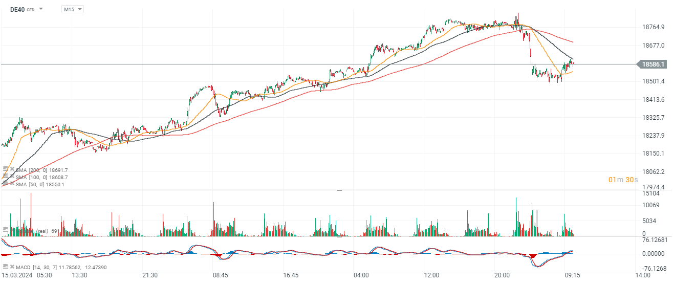 Choć dzisiejsze dane z Europy sugerują spowolnienie na kontynencie, niemieckie firmy przeważnie zyskują; częściowo dzięki perspektywom luzowania polityki EBC, częściowo z tytułu większości zysków generowanych z działalności poza granicami Starego Kontynentu. Gołębie komentarze Holzmanna z EBC sugerowały dziś, że stopa depozytowa powyżej 3% może okazać się ciężka do utrzymania, patrząc na ogólną koniunkturę, na europejskim kontynencie. Mimo słabszej sesji w Azji i spadków na Wall Street, DAX próbuje uwolnić się od spadkowej presji.