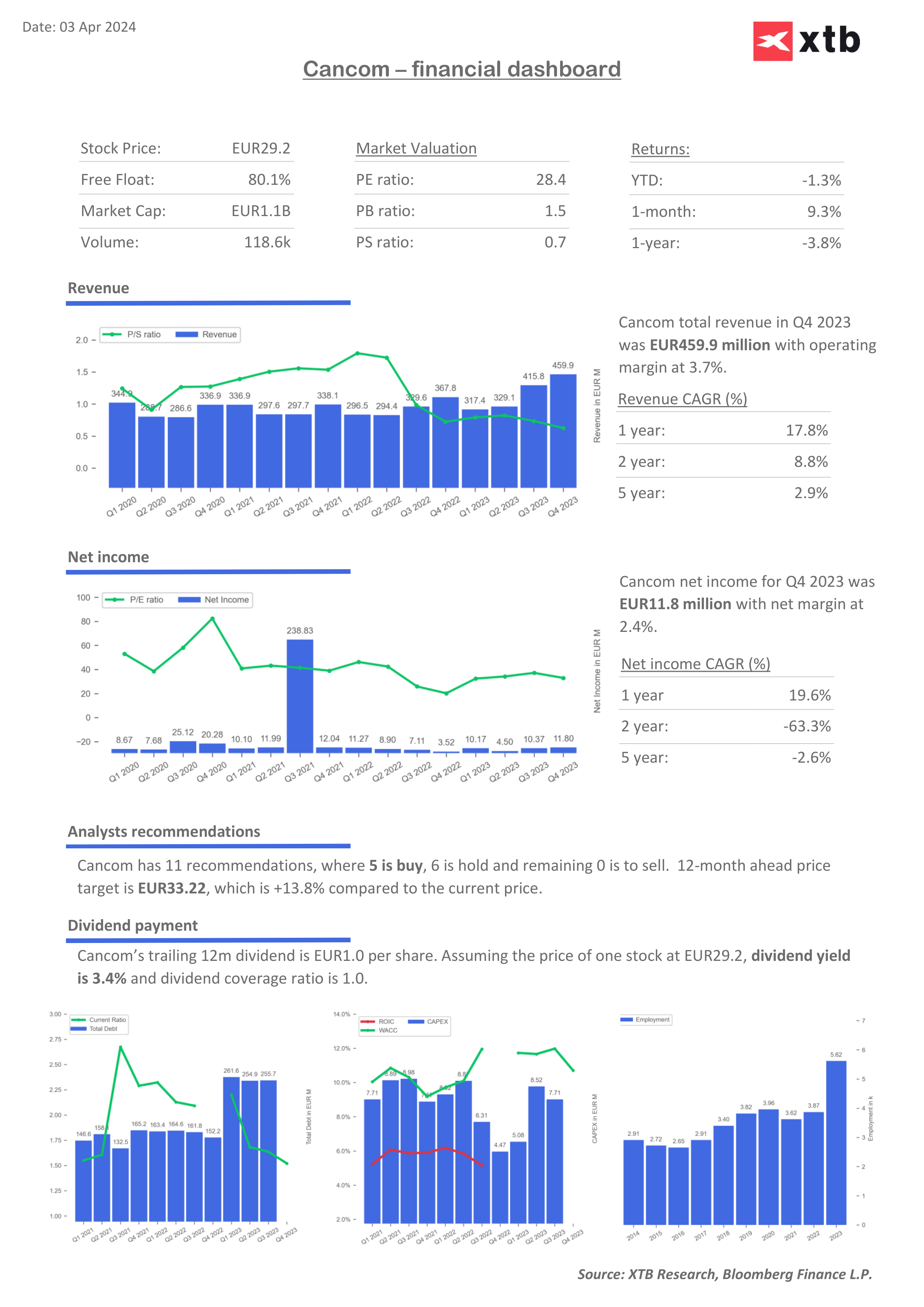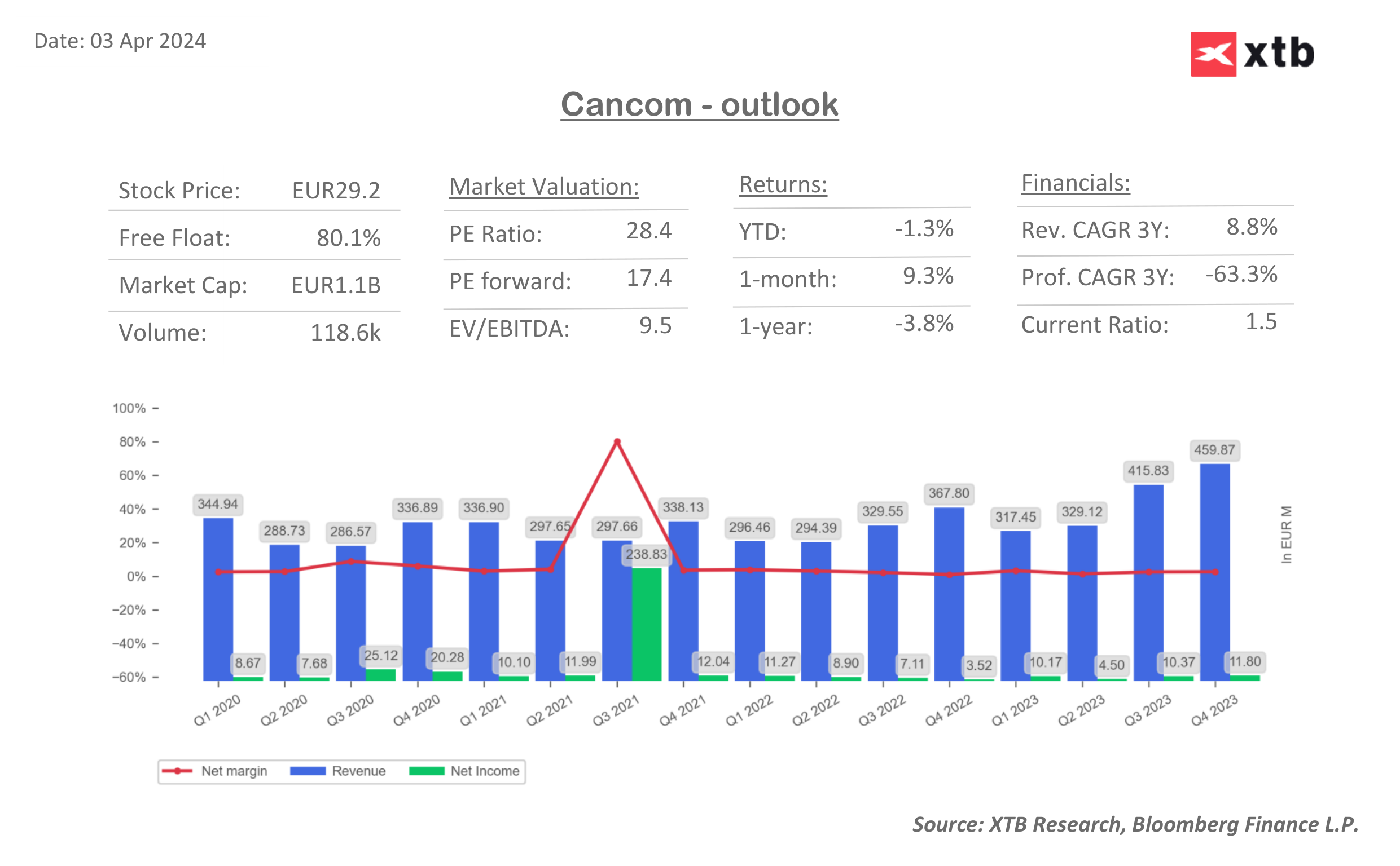 Spółka Cancom z niemieckiej branży IT, była w ostatnich latach jednym z najsłabszych walorów na niemieckiej giełdzie. Wyniki za rok 2023 zdołały nieznacznie pokonać prognozy i okazały się wyższe o 2,2% od strony zysków na akcję, w czasie gdy przychody okazały się zgodne z prognozą. Rynek (w przeciwieństwie do prognoz Zarządu) oczekuje jednak, że spółka będzie wciąż 'odstawała' i będzie zwiększała przychody o średnio 7,3% w ciągu najbliższych 3 lat wobec średniej 8,8% dla rynku IT w Niemczech. Przychody Cancom w 2023 wzrosły o 19% r/r do 1,54 mld EUR, a zysk netto poprawił się o 17% r/r i wzrósł do 37,9 mln EUR, przy zachowanych marżach operacyjnych na poziomie 2,25%. Zysk na akcję wzrósł w 2023 r/r o 15% i wyniósł 1,03 EUR wobec 0,9 EUR w 2022 roku.