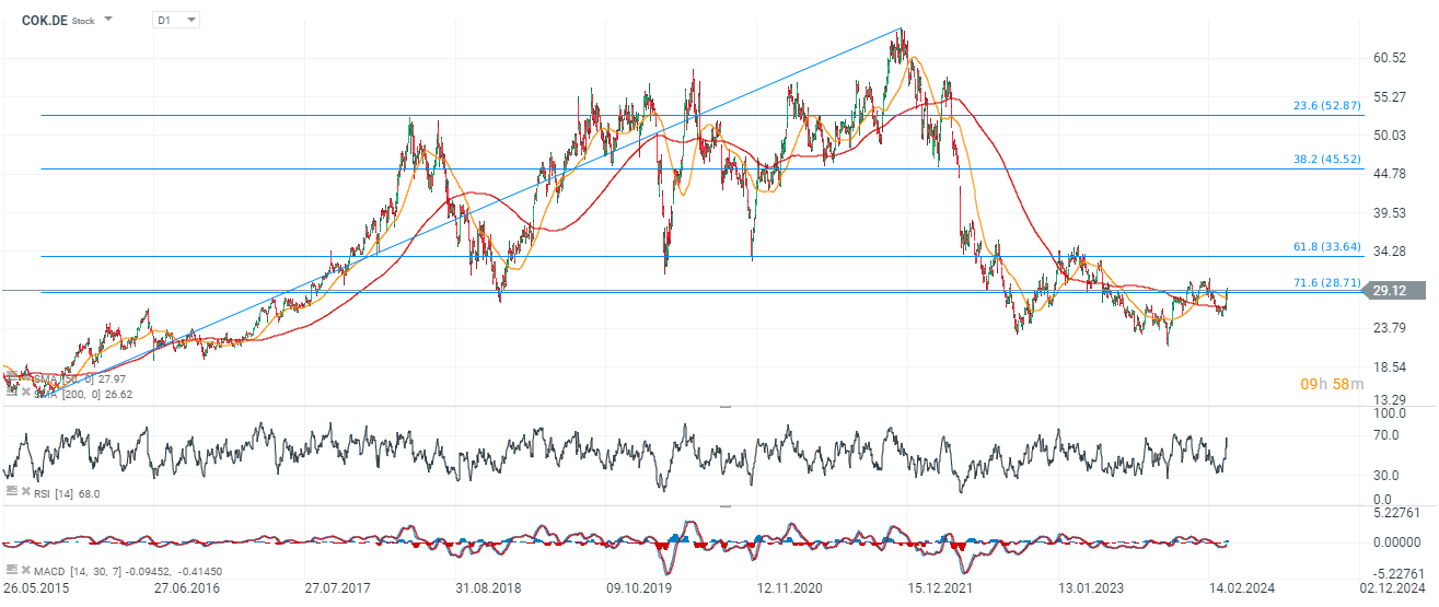 Walory zdołały przebić kluczowy opór w postaci 28,7 EUR za walor (71,6 zniesienie Fibonacciego fali wzrostowej z 2105 roku), co potencjalnie może otworzyć drogę do 33 EUR za akcję (61,8 Fibo).
