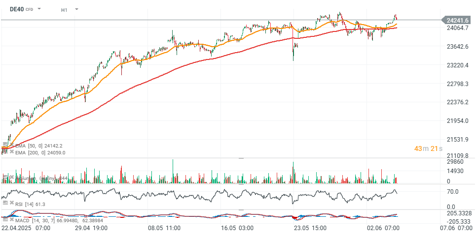 Kontrakty na amerykańskie indeksy notują dziś nieznacznie wzrosty, natomiast pozytywne sentymenty Wall Street 'udzielają się' europejskim indeksom. Rynek reaguje wzrostami także po zatwierdzeniu pakietu ulg podatkowych dla firm o wartości 46 miliardów euro w Niemczech, na lata 2025-2029. Pakiet ma na celu pobudzenie wzrostu w największej gospodarce Europy. Publikacje PMI za maj wskazały, że sektor usług w Niemczech odnotował najsilniejszy spadek aktywności od ponad dwóch lat.