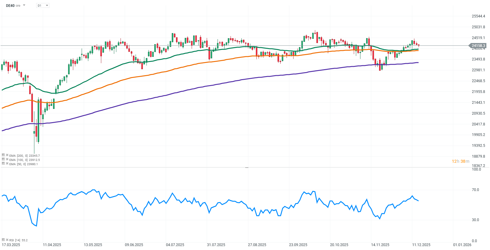 Dzisiejsze notowania kontraktów na indeks DE40 znajdują się pod wyraźną presją sprzedaży. Na korektę wpływają m.in. pogłoski o możliwym zakończeniu działań wojennych na Ukrainie, co wywołuje ostrożność inwestorów. Dodatkowo rynek oczekuje na kluczowe dane makroekonomiczne ze Stanów Zjednoczonych oraz na decyzje banków centralnych, co wprowadza niepewność i ogranicza większe ruchy cenowe. Mimo krótkoterminowej presji, szerzej rzecz biorąc, indeks pozostaje w fazie konsolidacji, oscylując wokół średnich kroczących 50-, 100- i 200-dniowych, co wskazuje na względną równowagę pomiędzy popytem i podażą. W perspektywie najbliższych sesji inwestorzy będą uważnie obserwować sygnały z rynków makroekonomicznych, które mogą przesądzić o kierunku kolejnych ruchów cenowych.