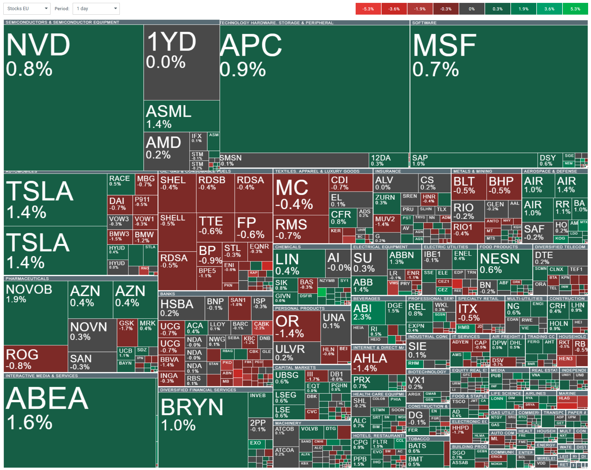 Ogólna sytuacja rynkowa: Europejskie rynki zmierzają dziś w kierunku mieszanego otwarcia. Szwajcarski SUI20 prowadzi, wzrastając o 0,2%, z indeksem NED25 o 0,15% wyżej. Niemiecki DAX handluje blisko otwarcia, podczas gdy francuski CAC40 jest 0,4% niżej. Wyższe niż oczekiwano dane PMI miały niewielki wpływ na rynek. EURUSD odrobił straty po osłabieniu się po publikacji danych. Euro i dolar amerykański pozostają obecnie najsilniejszymi walutami. Najlepiej radzącymi sobie sektorami na niemieckiej giełdzie są opieka zdrowotna i spółki technologiczne, ze średnimi zyskami 0,8%. Sektor dóbr konsumpcyjnych jest największym przegranym dzisiejszego dnia handlowego.