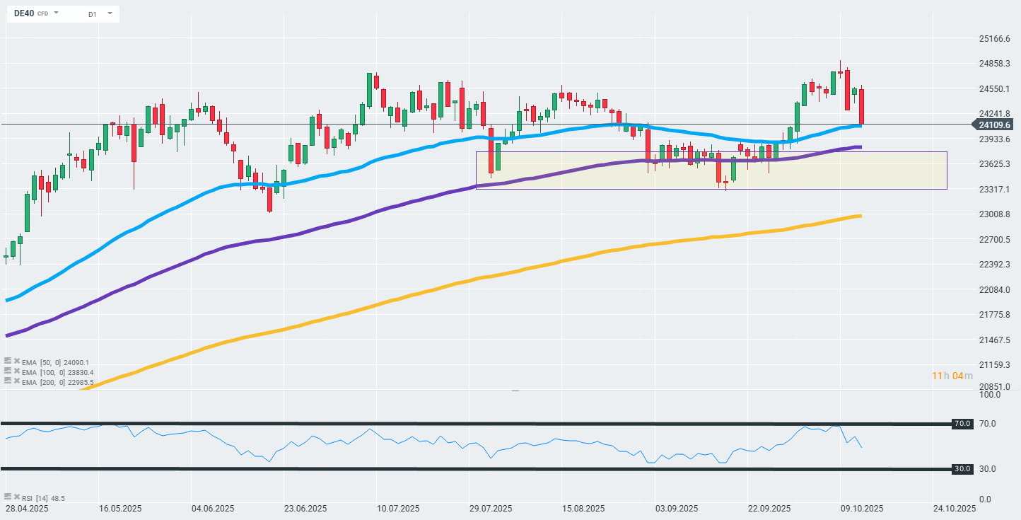 DAX spada podczas wtorkowej sesji i po raz kolejny testuje kluczowe poziomy wsparcia wyznaczone przez 50-dniową wykładniczą średnią kroczącą (niebieska krzywa na wykresie), co pokazuje, że mimo “cieplejszych” komunikatów na linii USA-Chiny, inwestorzy nadal obawiają się niepewności geopolitycznej albo wznawiają domykania pozycji długich po serii długich oraz dynamicznych zwyżek. Na ten moment jednak indeks cały czas utrzymuje techniczny trend wzrostowy, patrząc na układ notowań powyżej 50- oraz 100- dniowej EMA. RSI dla ostatnich 14 dni schodzi poniżej 70 punktów do strefy 49 punktów, czyli wartości relatywnie neutralnych niewskazujących na wyprzedanie ani wykupienie. Źródło: xStation