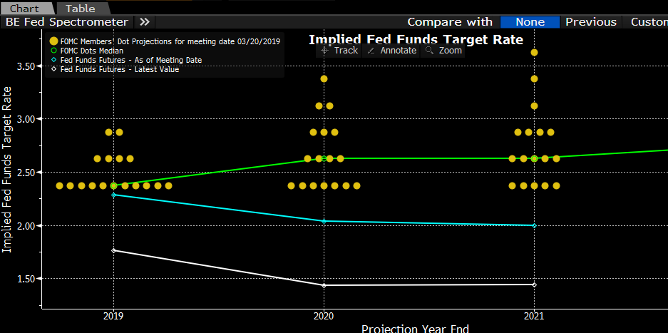 Rynek już w marcu oczekiwał obniżek w 2020 roku, zaś Fed komunikował podwyżki. Aby zachować „status quo” względem rynku, dot-plot musiałby zacząć teraz pokazywać spore cięcia. Brak takiej zmiany byłby dla rynku rozczarowaniem. Źródło: Bloomberg