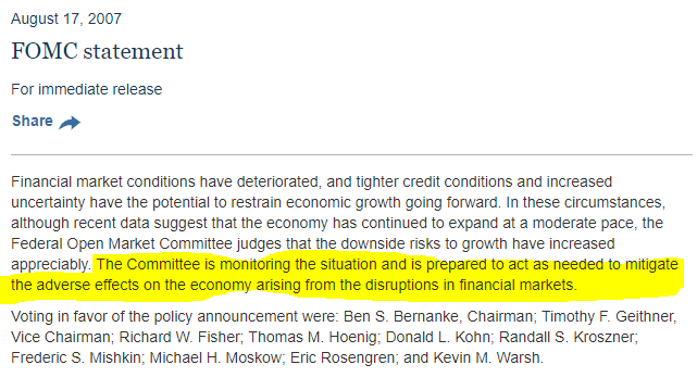 Jeśli takiego wskazanie nie będzie, wymowa nie będzie już tak jednoznaczna. Fed może zrobić tak jak w komunikacie po specjalnej telekonferencji z sierpnia 2007, gdzie zasygnalizował gotowość do obniżek. Wtedy również stopy zostały obniżone na kolejnym posiedzeniu (zaś w niecałe 2 miesiące po tej telekonferencji S&P500 wyznaczył szczyt hossy).