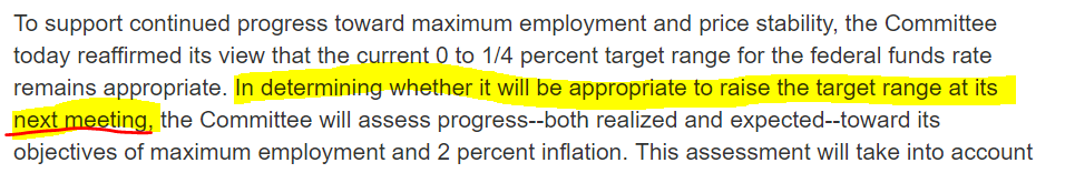 Gdyby Fed wskazał, że na lipcowym posiedzeniu rozważy obniżkę, byłoby to bardzo gołębie i zapewne doprowadziło do osłabienia dolara i wzrostów indeksów. Takie wskazanie (w drugą stronę) pojawiło się w komunikacie z października 2015. Źródło: federalreserve.com