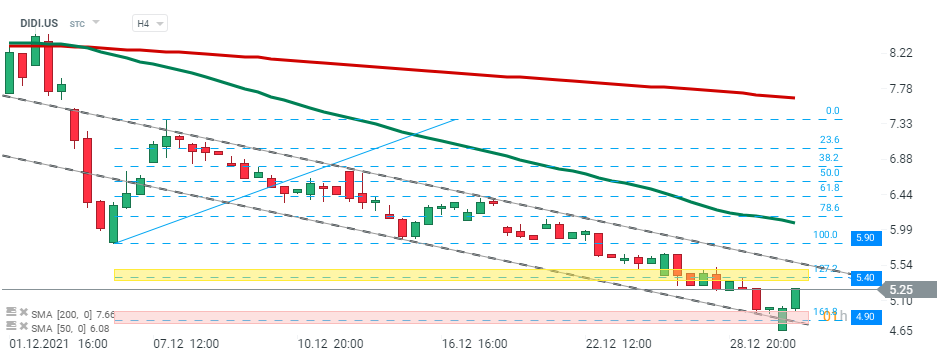 Akcje Didi Global (DIDI.US) zdołały odrobić straty przedsesyjne i są notowane o ponad 6% wyżej w porównaniu do wczoraj, nawet mimo tego, że chińska firma oferująca usługi przewozowe odnotowała w trzecim kwartale 1,7% spadek przychodów i stratę w wysokości 4,7 mld USD, spowodowaną przez represje regulacyjne. Po tym, jak firma zadebiutowała na NYSE w czerwcu, chiński rząd nakazał jej usunięcie aplikacji ze sklepów z aplikacjami mobilnymi, podczas gdy chińska administracja zajmująca się cyberprzestrzenią badała, w jaki sposób firma zajmuje się danymi klientów. Z powodu ciągłej presji ze strony chińskich regulatorów Didi zdecydowała się wycofać z giełdy nowojorskiej i kontynuować notowania w Hongkongu. Na wyniki firmy zaważyła również rosnąca konkurencja ze strony innych spółek przewozowych, takich jak producenci samochodów Geely Holding Group i SAIC Motor Corp Ltd. Akcje Didi Global (DIDI.US) rozpoczęły dzisiejszą sesję niżej wokół głównego wsparcia na 4,90 USD, które jest wzmocnione przez zewnętrzne zniesienie Fibonacciego 161,8% z ostatniej fali wzrostowej, jednak wydaje się, że inwestorzy zignorowali ostatnie wiadomości i zdecydowali się kupić akcje na „dołku”. Obecnie cena zbliża się do górnej granicy kanału spadkowego w okolicach 5,40 USD. Jeśli nastąpi wybicie oporu, ruch w górę może przyspieszyć w kierunku kolejnej strefy podażowej przy 5,90 USD, która jest zaznaczona wcześniejszymi reakcjami cenowymi. Źródło: xStation5