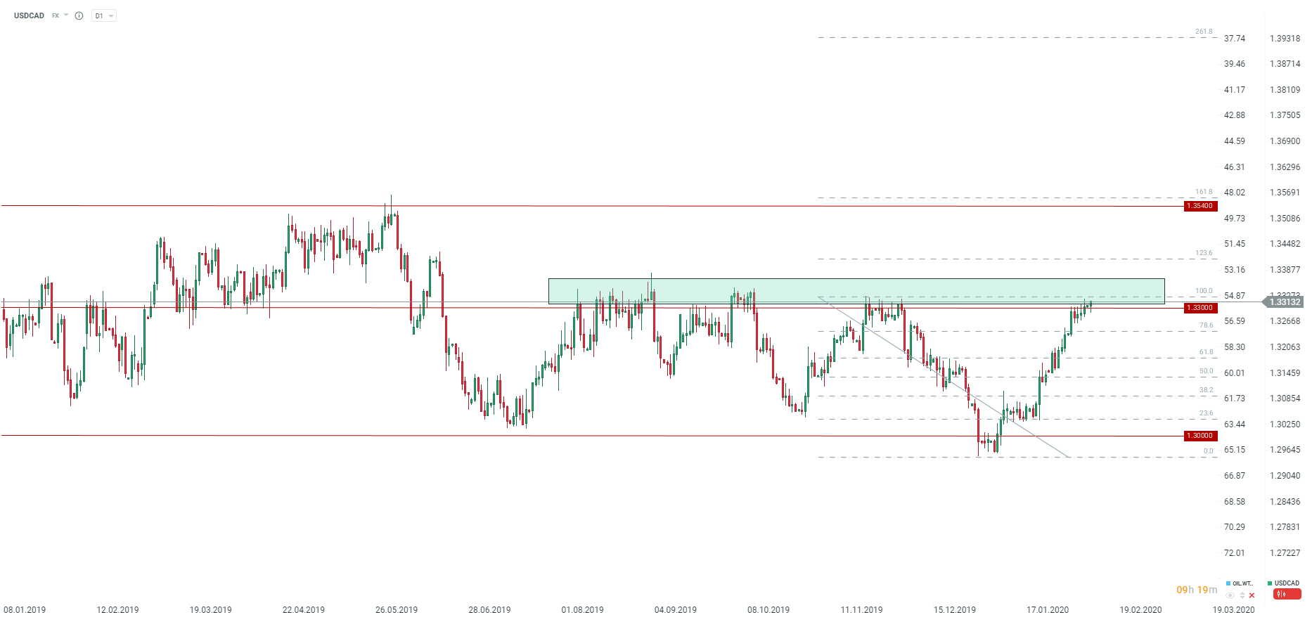 USDCAD rośnie dzisiaj, pomimo dobrych danych z rynku nieruchomości z Kanady. Zmienność jest jednak dosyć mocno ograniczona. Źródło: xStation5