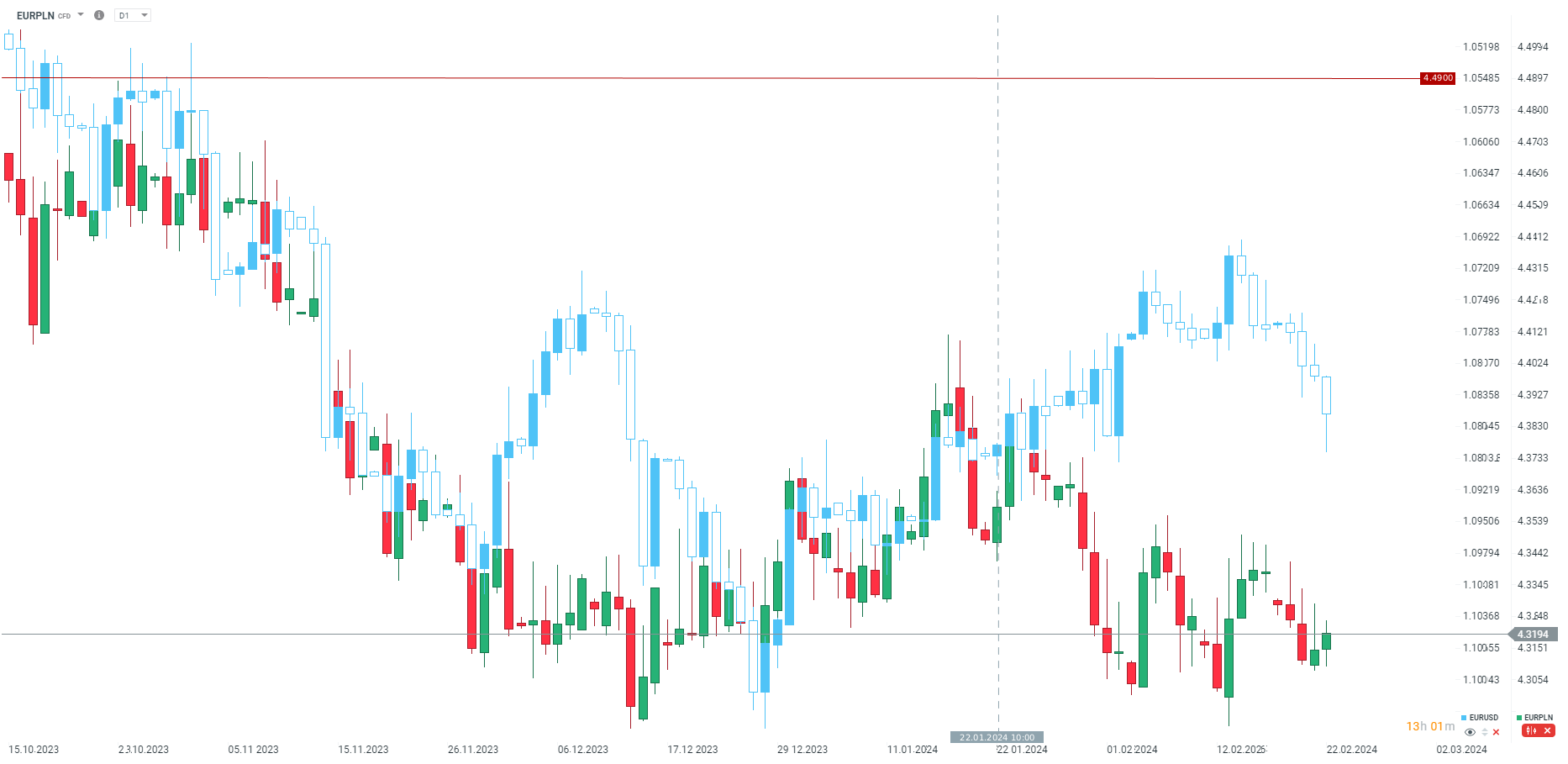 Złoty traci dzisiaj. EURPLN nieco w górę testuje okolice 4,32 zł. Jak widać, nie jest wykluczone, że dojdzie do domykania dywergencji z EURUSD. Warto też wspomnieć, że za słabość złotego może odpowiadać ostatni komentarz członka RPP, Koteckiego, który stwierdził, że w tym roku jest szansa na obniżki. Kotecki był jednym z większych jastrzębi w zeszłym roku.