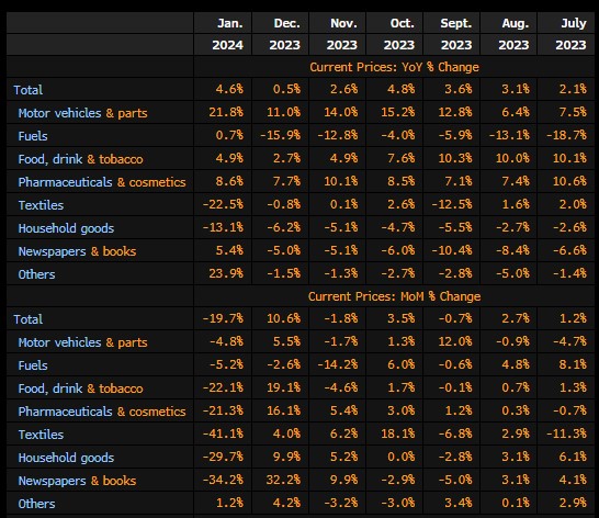 W ujęciu miesięcznym mamy jednak potężny spadek! Jest to spadek na poziomie 19,5% m/m w ujęciu realnym (nominalnie podobnie), ale było to oczekiwane przez rynek. Oczekiwania wskazywały na spadek na poziomie 20,6% m/m przy poprzednim wzroście na poziomie 11% m/m. Oczywiście jest to powiązane z grudniowym wzrostem sprzedaży ze względu na święta.