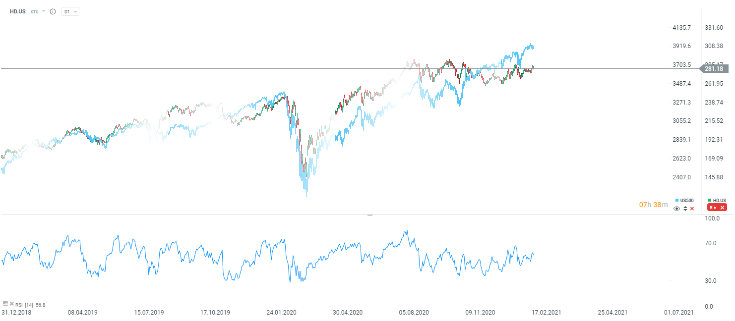 Home Depot (HD.US) od dłuższego czasu znajduje się w konsolidacji, w przeciwności do US500, który cały czas utrzymuje trend wzrostowy od zeszłorocznej silnej wyprzedaży. Źródło: xStation5