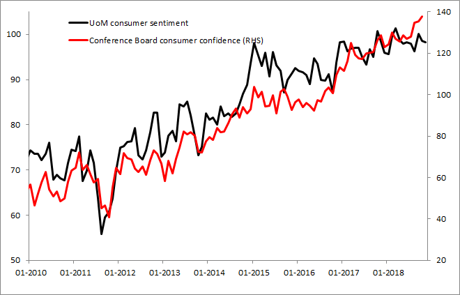 Oprócz tego poznaliśmy dzisiaj dane dotyczące nastrojów konsumentów. Indeks UoM spada mniej od oczekiwań rynkowych, jednak wciąż prezentuje sporą dywergencję z indeksem prezentowanym przez Conference Board. Jak widać w ostatnich kilku latach zazwyczaj indeks UoM był tym bardziej zmiennym i prezentował relatywnie wyższe wskazania niż indeks CB. Jeżeli kolejne miesiące przynosią wzrosty, będzie to oznaczało powrót do normalnej sytuacji. W przeciwnym razie może to być sygnał ostrzegawczy dla Wall Street oraz dolara.