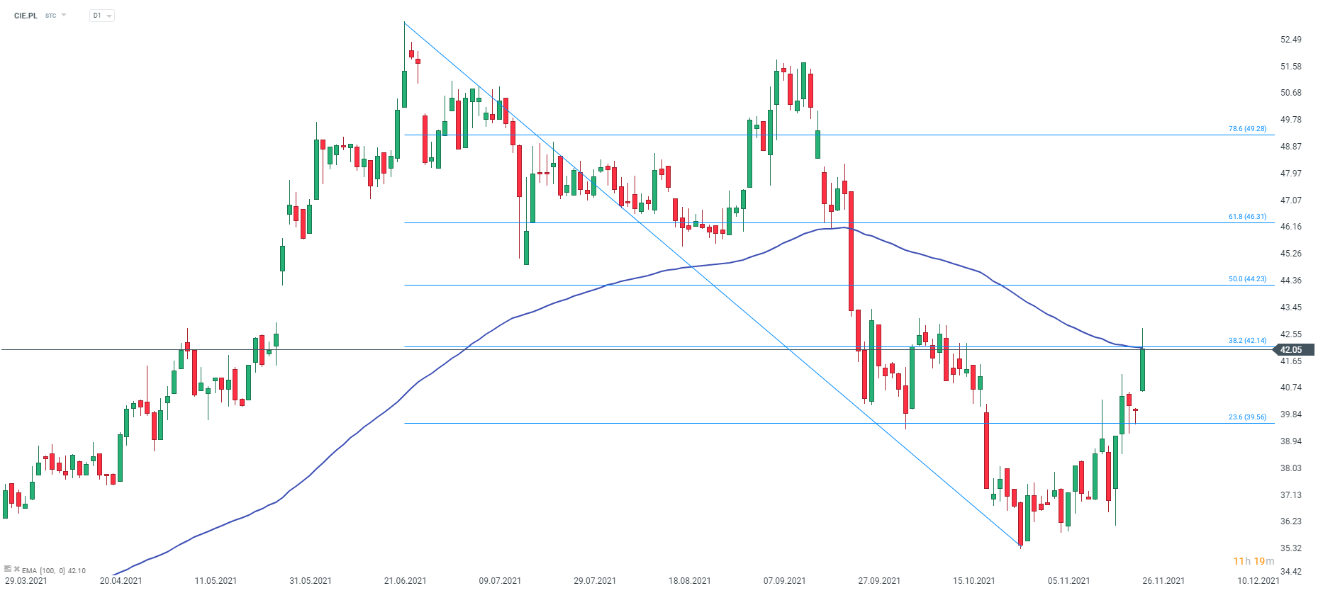 Wykres walorów spółki Ciech (CIE.PL), interwał D1. Jeden z liderów rynku chemicznego notuje dzisiaj dynamiczne wzrosty mimo pesymizmu związanego z pojawieniem się nowej mutacji. Rynek testuje obecnie silny opór, który zbiega się z 100 okresową średnią kroczącą oraz zniesieniem 38,2% Fibo. Wybicie górą tego poziomu może zachęcić stronę popytu, aby przetestować kolejne ograniczenie, blisko 44 zł za akcję. Jeśli natomiast podaż przejmie kontrolę nad walorami spółki, możliwe będzie zejście w rejony lokalnego dołka, przy 35,4 zł za akcję. Źródło: xStation 5