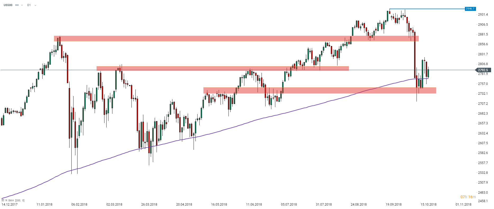 Indeks US500 zatrzymał wczorajsze spadki na 200-sesyjnej średniej kroczącej (fioletowa linia na powyższym wykresie). Warto zaznaczyć, że ten techniczny poziom już kilkukrotnie w tym roku zatrzymywał spadki, tak więc warto mieć na uwadze w momencie kiedy sprzedający ponownie dojdą do głosu. Indeks stara się wspiąć powyżej bariery 2800 pkt. Źródło: xStation5