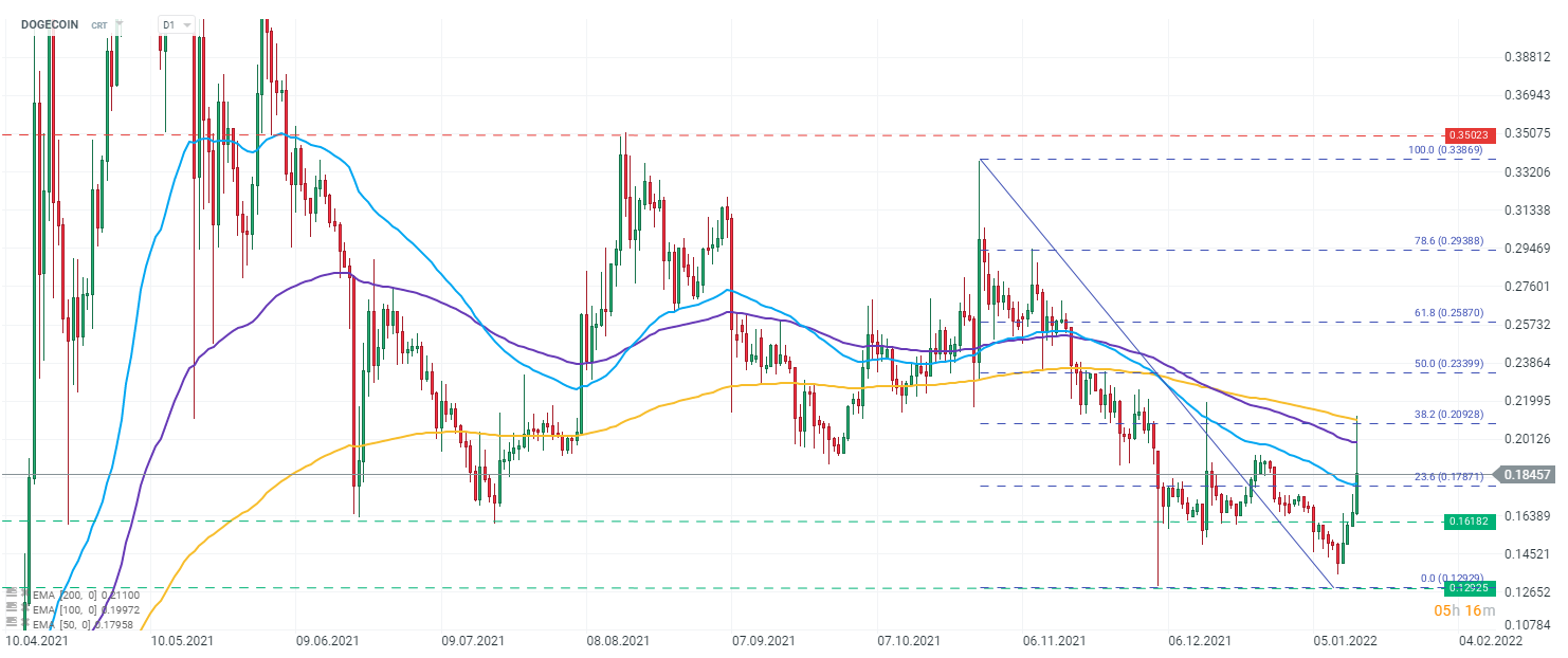 Patrząc na wykres DOGECOINA na interwale D1 zauważamy, że wzrosty zatrzymane zostały na oporze wyznaczonym przez EMA 200 (złota linia) oraz zniesieniu 38,2% Fibo. Obecnie notowania spadły poniżej tych ograniczeń i teraz walczą o utrzymanie powyżej EMA 50 (niebieska linia). Źródło: xStation 5