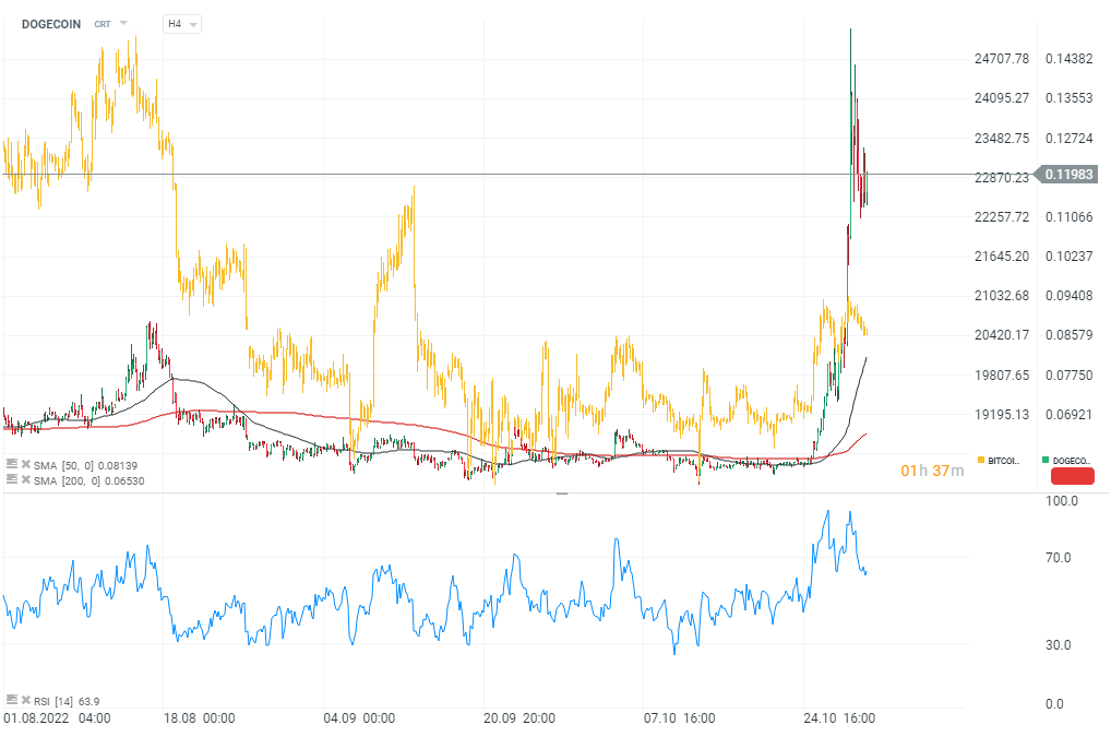 Kryptowaluta Dogecoin, jedno z najabardziej aktywnych i popularnych aktywów 'spekulacyjnych' rynku crypto w ciągu ostatnich 3 dni wzrosła o ponad 100% po tym jak Elon Musk sfinalizował ofertę przejęcia Twittera: