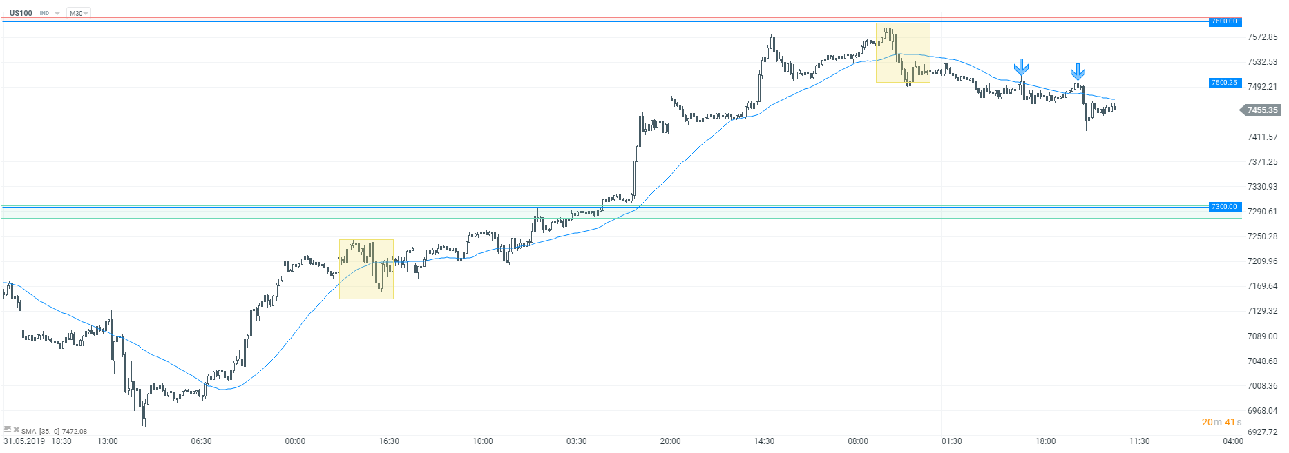 Odnosząc się do wczorajszej analizy indeksu NASDAQ (US 100), kurs utrzymuje się poniżej wyznaczonej strefy oporowej, co może prowadzić do pogłębienia korekty spadkowej. Dopiero pokonanie poziomu 7500 pkt, może doprowadzić do powrotu do tendencji wzrostowej.