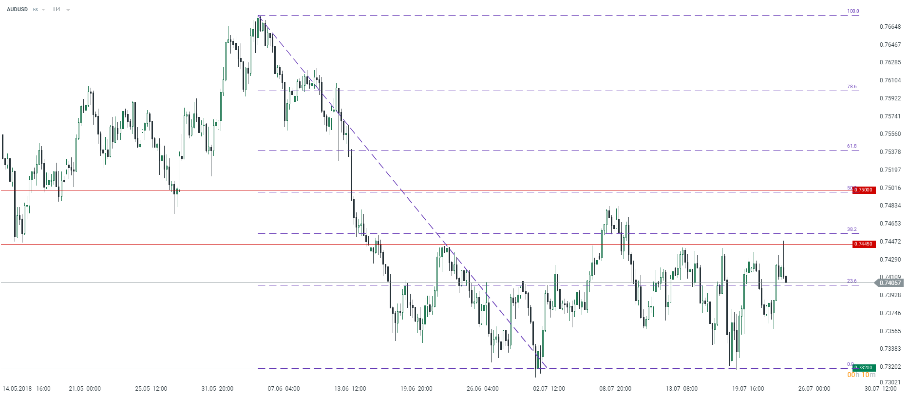 Podczas sesji azjatyckiej obserwowaliśmy kolejną dewaluację chińskiego juana. PBoC wyznaczył kurs niewiele powyżej 6,8, co jest poziomem najwyższym od czerwca 2017 roku. Chińskie akcje zdają się minimalizować to ryzyko i główne benchmarki Państwa Środka kończą sesję bez większych zmian. Obok chińskiej polityki monetarnej warto zwrócić uwagę na dane handlowe z Nowej Zelandii za czerwiec, które wskazały na deficyt w wysokości 113 mld USD wobec oczekiwań 200 mld USD nadwyżki. Dane pokazały nieznaczny spadek importu oraz większe spowolnienie eksportu. Dodatkowo API podało cotygodniowe dane o zapasach ropy. Odczyt wskazał na spadek o 3,2 mln baryłek. Rządowy raport DOE zostanie opublikowany dzisiaj o godzinie 16:00. Ceny ropy niewiele zyskują o poranku.