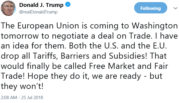 Tymczasem prezydent USA Donald Trump na Twitterze wezwał do wolnego handlu z Unią Europejską. Stwierdził, że Stany Zjednoczone są gotowe znieść cła wobec UE. Trump w swojej wiadomości wątpi jednak, że decydenci Unii Europejskiej wyrażą zgodę na jego propozycje. Brzmi to jednak trochę dziwnie, ponieważ Trump mógł zapomnieć Partnerstwie Transpacyficznym i wycofaniu się jego kraju z tego porozumienia. Negocjacje w Waszyngtonie powinny być bardzo napięte, ale ich konsekwencje z pewnością będą daleko idące. Trzeba pamiętać, że jeszcze dwa tygodnie temu prezydent USA nazwał UE “wrogiem”.