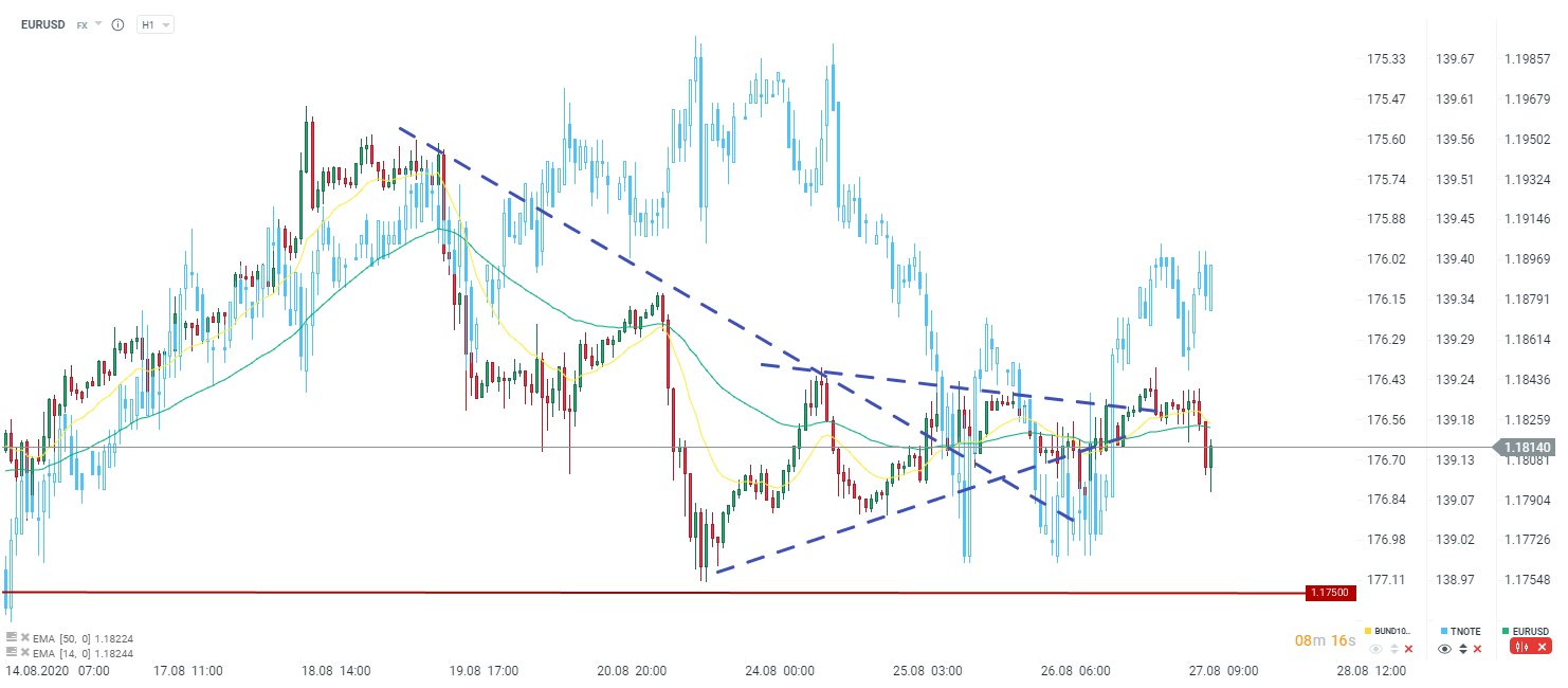 Dzisiaj kluczowym wydarzeniem dla dolara jest wystąpienie Powella w ramach sympozjum ekonomicznego Jackson Hole. Oczekiwania są gołębie, a przede wszystkim mówi się o możliwym wprowadzeniu średniego celu inflacyjnego, co mogłoby pozwolić na przestrzelenie inflacji w momencie ożywienia (opóźnianie podwyżek stóp procentowych). Z drugiej strony FED zrobił w ostatnich miesiącach już sporo i może się okazać, że dzisiejsze wystąpienie będzie rozczarowaniem dla rynku.
