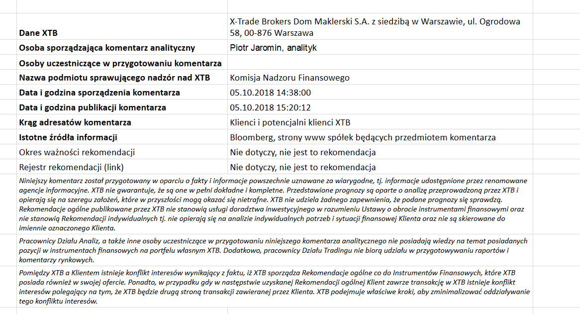 Ta publikacja handlowa jest informacyjna i edukacyjna. Nie jest rekomendacją inwestycyjną ani informacją rekomendującą lub sugerującą strategię inwestycyjną. W materiale nie sugerujemy żadnej strategii inwestycyjnej ani nie świadczymy usługi doradztwa inwestycyjnego. Materiał nie uwzględnia indywidualnej sytuacji finansowej, potrzeb i celów inwestycyjnych klienta. Nie jest też ofertą sprzedaży ani subskrypcji. Nie jest zaproszeniem do nabycia, reklamą ani promocją jakichkolwiek instrumentów finansowych. Publikację handlową przygotowaliśmy starannie i obiektywnie. Przedstawiamy stan faktyczny znany autorom w chwili tworzenia dokumentu. Nie umieszczamy w nim żadnych elementów oceniających. Informacje i badania oparte na historycznych danych lub wynikach oraz prognozy nie stanowią pewnego wskaźnika na przyszłość. Nie odpowiadamy za Twoje działania lub zaniechania, zwłaszcza za to, że zdecydujesz się nabyć lub zbyć instrumenty finansowe na podstawie informacji z tej publikacji handlowej. Nie odpowiadamy też za szkody, które mogą wynikać z bezpośredniego czy też pośredniego wykorzystania tych informacji. Inwestowanie jest ryzykowne. Inwestuj odpowiedzialnie.