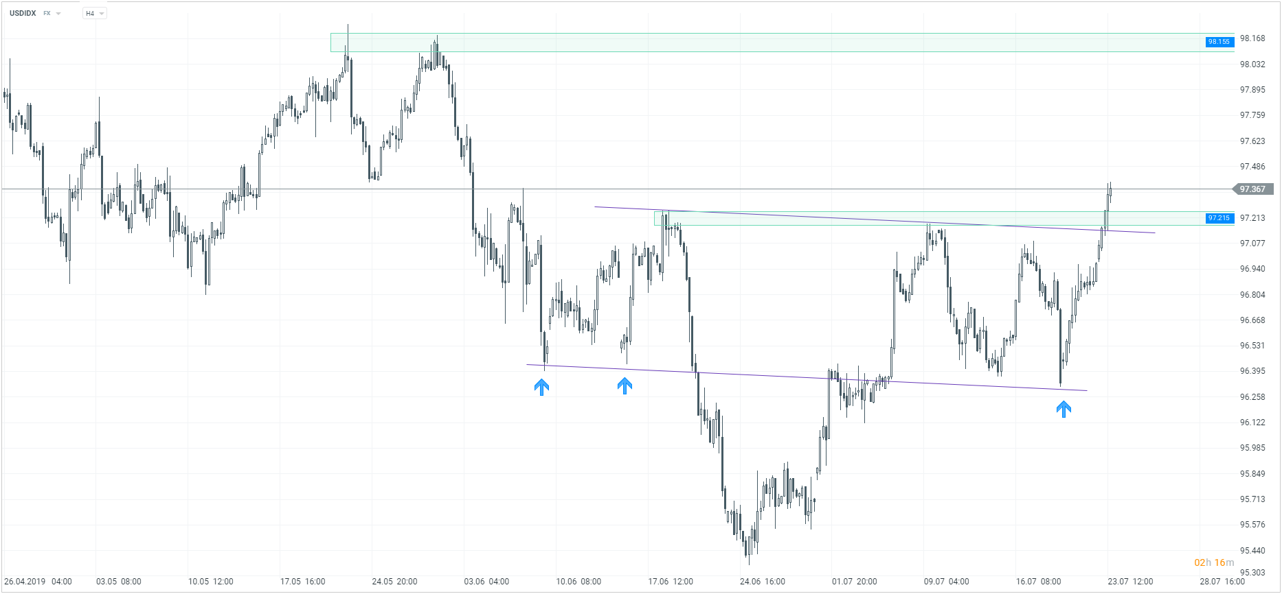 Dolar zyskuje dziś zarówno do euro, funta, jena jak i franka szwajcarskiego. Zobaczmy jak przedstawia się sytuacja techniczna na indeksie dolara oraz parze walutowej EURUSD. Jeśli chodzi o indeks dolara, doszło dziś do pokonania kluczowego oporu. Mowa tutaj o strefie podażowej przy 97,20, gdzie wypadają między innymi linia szyi formacji oRGR, a także ostatnie liczące się wierzchołki. Zgodnie z założeniami klasycznej analizy technicznej jest to sygnał do wzrostów. Tak długo jak kurs będzie się utrzymywał powyżej poziomu 97,20, obowiązuje tendencja wzrostowa. Niewykluczony jest retest wybitej strefy, a następnie dalszy ruch w górę.