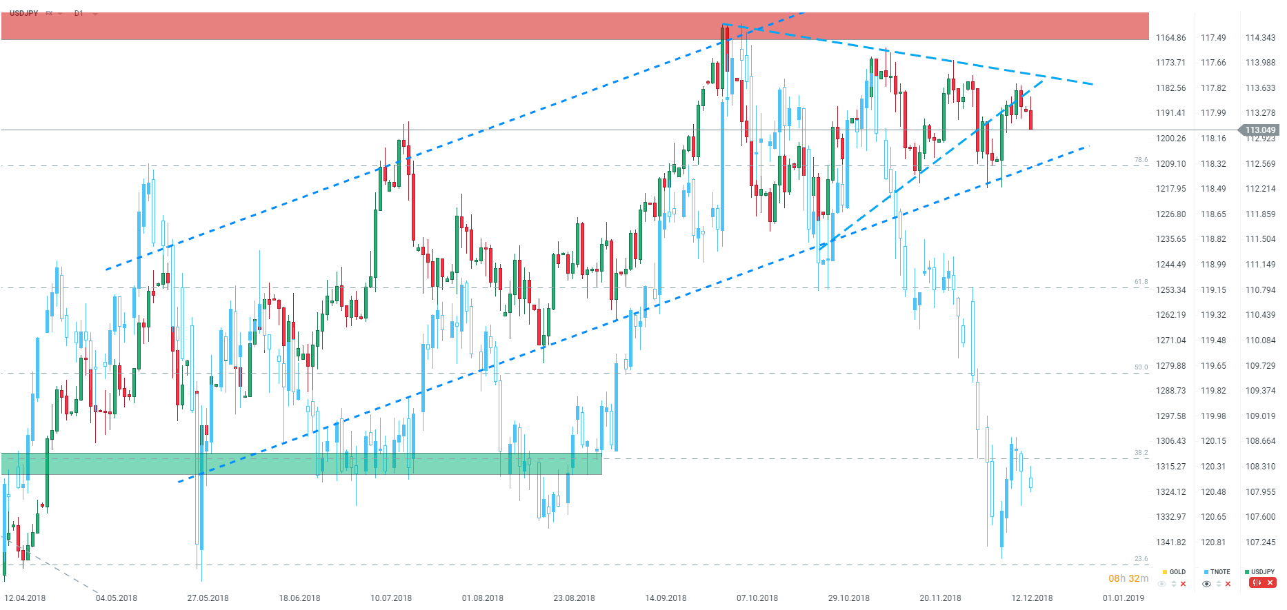 Tymczasem obserwujemy wyraźnie słabszego dolara w ostatnich minutach. Para USDJPY jest najsłabsza od połowy zeszłego tygodnia, wyznaczając w piątek kolejny niższy szczyt. Para testuje obecnie okolice poziomu 113,00. Obecnym celem dla pary są okolice poziomu 112,60 przy zniesieniu 78.6 oraz przy dolnym ograniczeniu wzrostowego kanału trendowego.