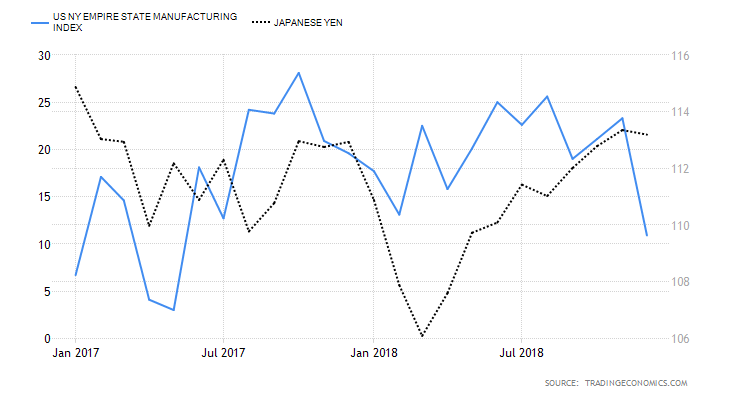 Indeks NY Empire wyraźnie spada z okolic 20 do 10 punktów, co może być sygnałem ostrzegawczym dla gospodarki oraz dolara. Źródło: Trading Economics