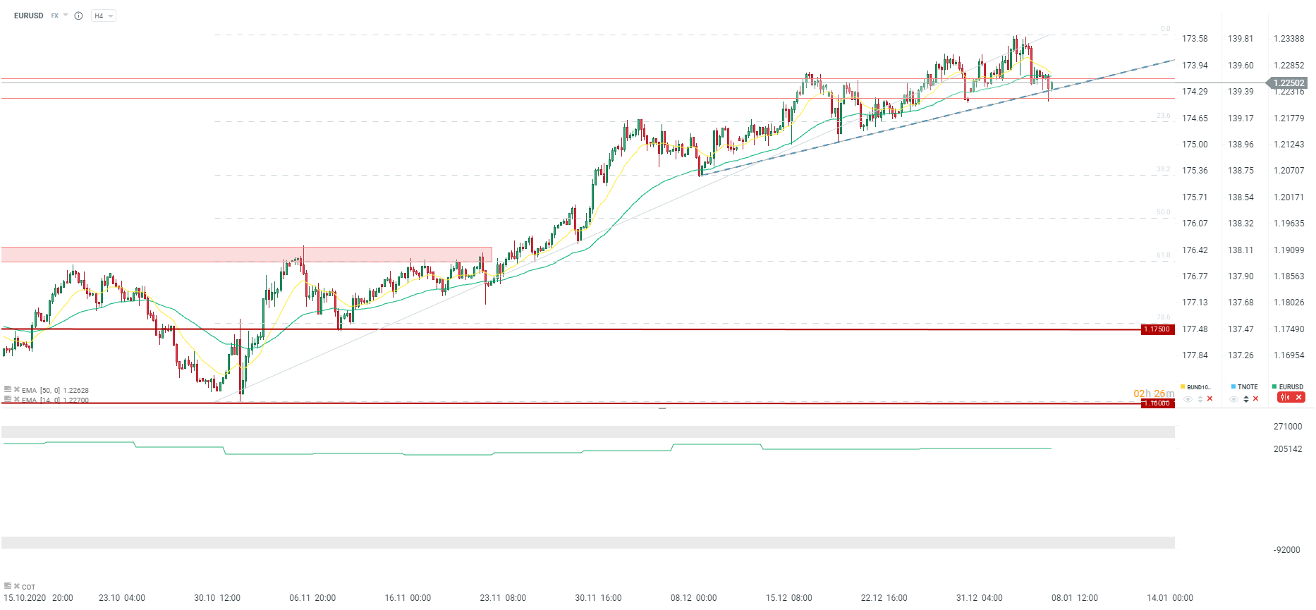 Pomimo tego, że dzisiejszy raport NFP może być sporym zaskoczeniem, rynek wciąż powinien jednak rozgrywać czynniki powiązane z przejęciem władzy przez Demokratów w USA. Konsensus dla NFP wynosi 50 tys., po listopadowym odczycie na poziomie 245 tys. Z drugiej strony raport ADP pokazał zaskakująco -123 tys, a subindeks zatrudnienia w ISM dla usług spadł poniżej 50. Warto jednak pamiętać, że na koniec grudnia przyjęto pakiet stymulacyjny, który w dużej mierze odmieni sytuację na rynku pracy w USA. Z kolei badanie NFP pochodzi z początku poprzedniego miesiąca. Niemniej negatywny odczyt NFP może nadać presję na władzy, aby dostarczyć kolejne wsparcie dla gospodarki.