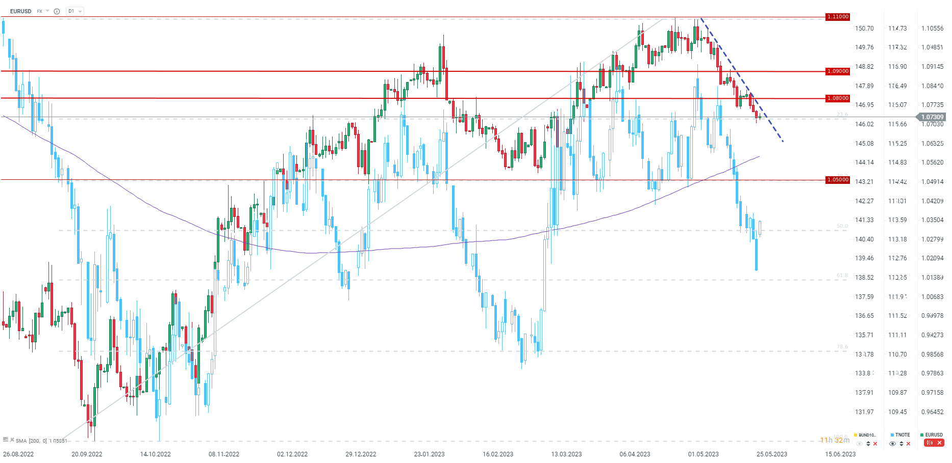 EURUSD od początku maja kontynuuje serię nowych niższych dołków i szczytów, wraz z dalszym wzrostem rentowności. Obecnie EURUSD testuje zniesienie 23.6 całego ruchu wzrostowego od września zeszłego roku. Przebicie tego wsparcia mogłoby skłonić do zejścia przynajmniej w okolice 1,0700. Z drugiej strony, jeśli inflacja zaskoczy dzisiaj większym spadkiem, może dojść do próby przełamania linii trendu spadkowego i podejścia w okolice oporu przy poziomie 1,0800. Źródło: xStation5