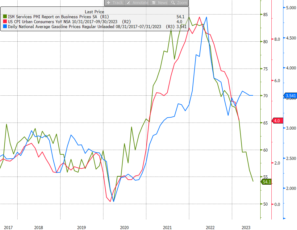 Usługi wskazują, że inflacja może spaść naprawdę głęboko. Z drugiej strony pojawiają się takie czynniki jak utrzymywanie cen paliw na względnie stałym poziomie od wielu miesięcy, co w dalszej części roku może przerodzić się w odbicie inflacji. Źródło: Bloomberg, XTB