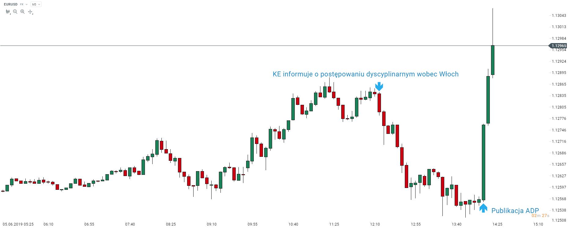 Kurs EURUSD wystrzelił po publikacji danych ADP. Para wymazała już całość spadków wywołanych wcześniejszym ogłoszeniem Komisji Europejskiej. Źródło: xStation5