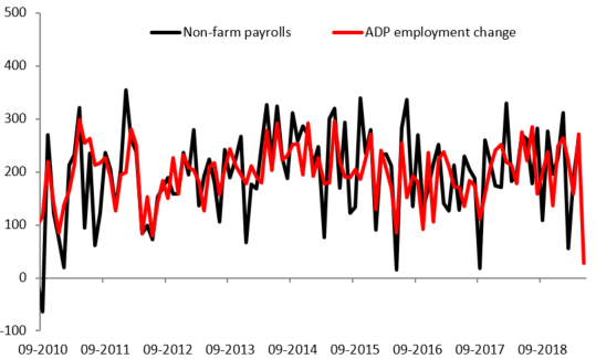 Najsłabszy odczyt danych ADP od marca 2010 roku. Publikacji sprawia, że oczekiwania wobec piątkowego raportu NFP są niższe. Źródło: Macrobond, Dział Analiz XTB