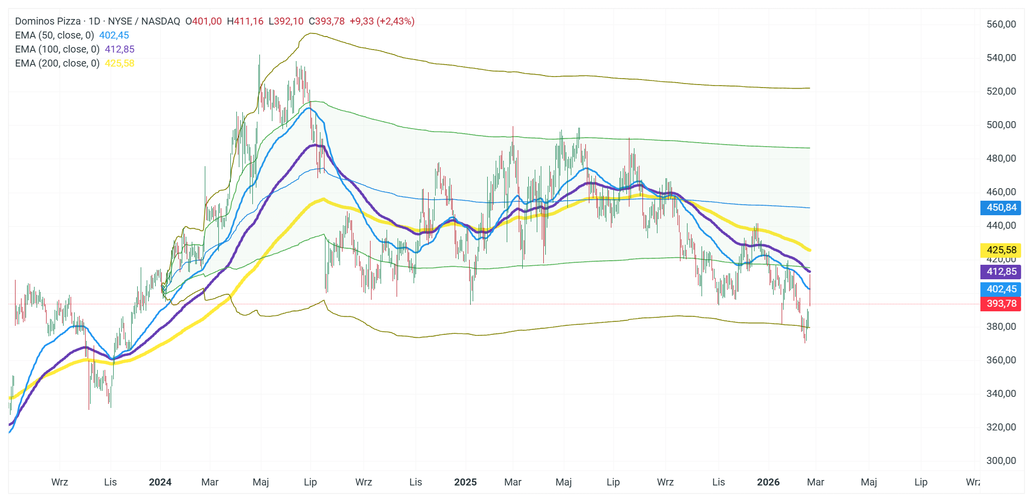 CEO Russell Weiner nazwał 2025 r. dowodem na siłę modelu – „Hungry for MORE”. Podwyżka dywidendy o 15% do 1,99 USD kwartalnie (wypłata 30 marca) sygnalizuje pewność wzrostu w 2026 r., gdzie oczekuje „znaczącego” wzrostu udziału rynkowego. Akcje DPZ rosną dzisiaj blisko 3%.