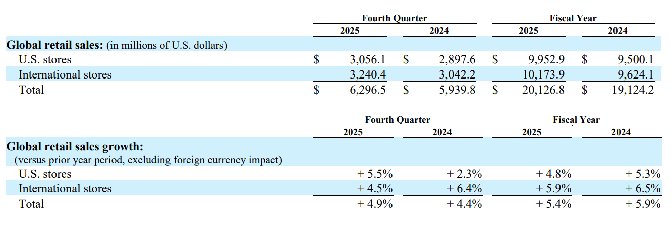Sieć restauracji Domino's rośnie dynamicznie – netto +392 sklepy w Q4 (+776 za rok), docierając do 22 142 globalnie. Zysk operacyjny Q4 wzrósł +8,0% do 295,7 mln USD (+8,5% za rok do 954 mln USD), ex-FX nawet lepiej (+7,3% Q4). Wolne przepływy pieniężne eksplodowały +31,2% do 671,5 mln USD, finansując wykup akcji za 354,7 mln USD (w tym 80 mln USD Q4), z pozostałymi 459,7 mln USD w programie.