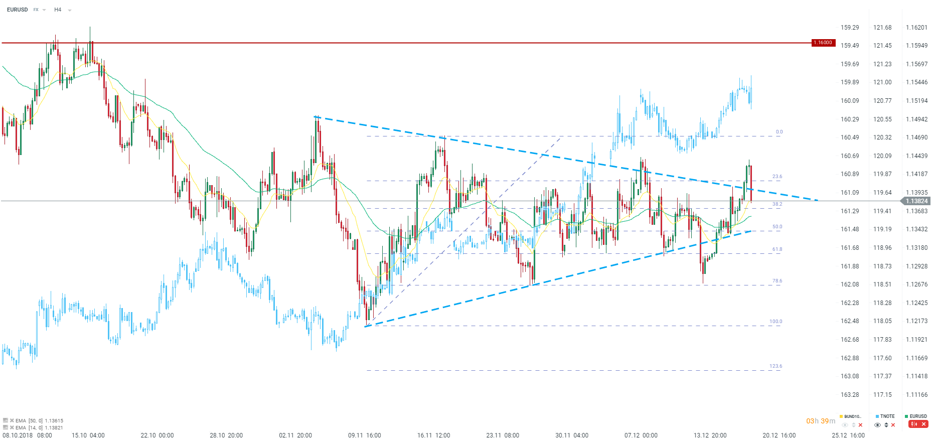 Wyraźny spadek na EURUSD, który ciągnie złoto w kierunku 1240 USD za uncję. na EURUSD nieznacznie poniżej 1,1390 znajduje się strefa wsparcia wyrysowana przez średnie ruchome. Kluczowe wsparcie w okolicach 1,1340. W tym samym czasie rentownosci w USA spadają w odpowiedzi na obniżenie celu dla długoterminowej stopy procentowej. Źródło: xStation5