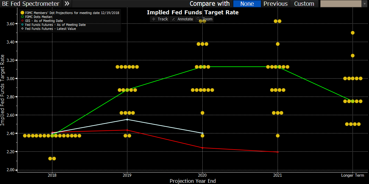 Fed obniża nieznacznie krzywą dla stóp procentowych, ale jednocześnie na przyszły rok wskazuje na większą ilość podwyżek niż oczekiwał tego rynek. Źródło: Bloomberg