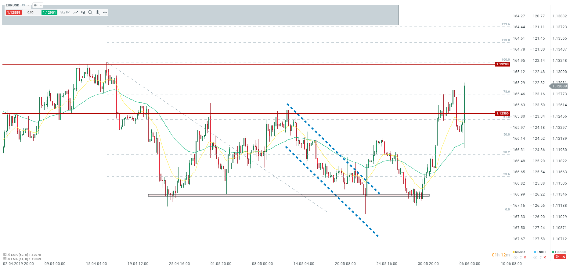 EURUSD wyraźnie zyskuje podczas konferencji Mario Draghiego. Nie jest gołębio tak jak oczekiwały tego rynki. Projekcje również nie zostały obniżone tak jak oczekiwały tego rynki. Niemniej ruch wzrostowy na samej sile euro może być ograniczony. Źródło: xStation5