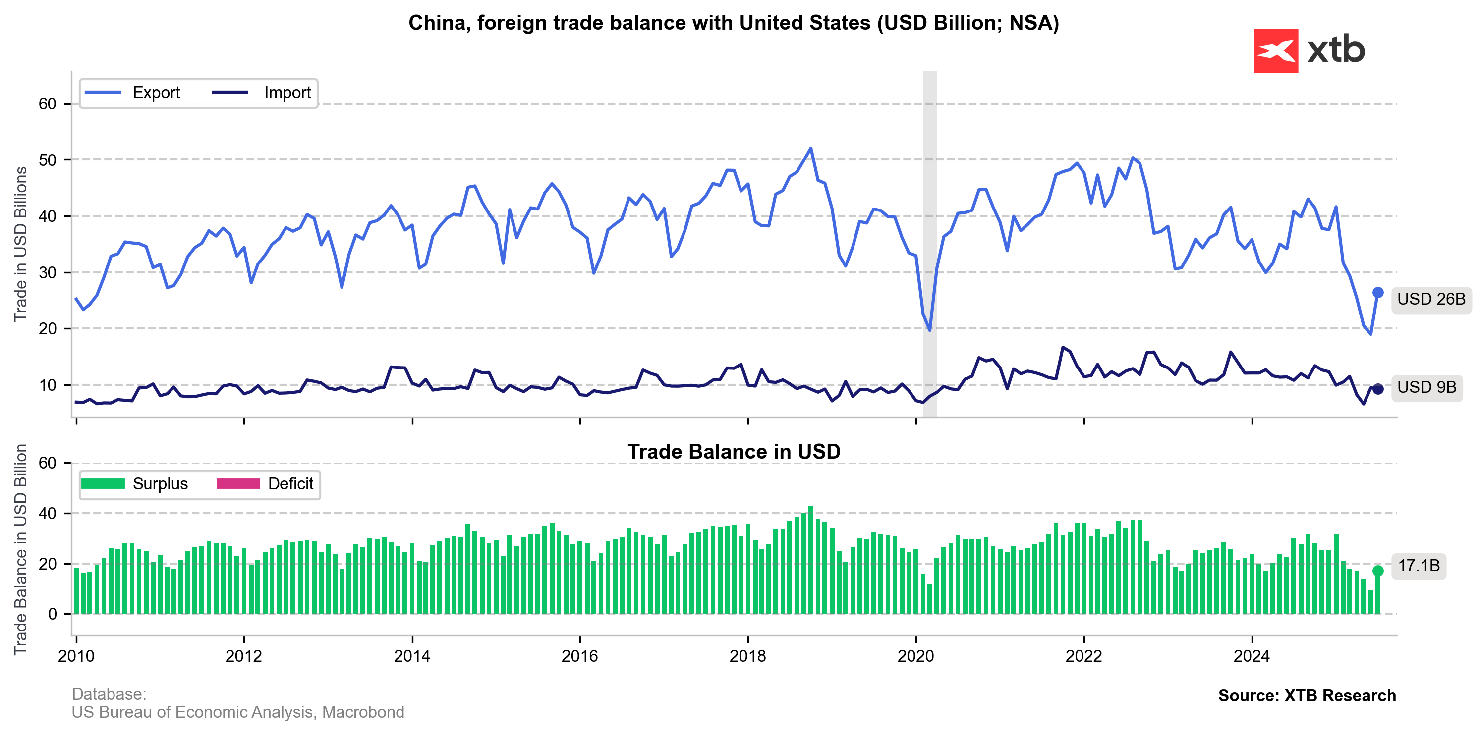 Eksport do USA znacznie spadł od momentu rozpoczęcia wojny handlowej w kwietniu. Pozostałe regiony zrównoważyły ten spadek. Z kolei import do Chin z USA pozostaje względnie stały.