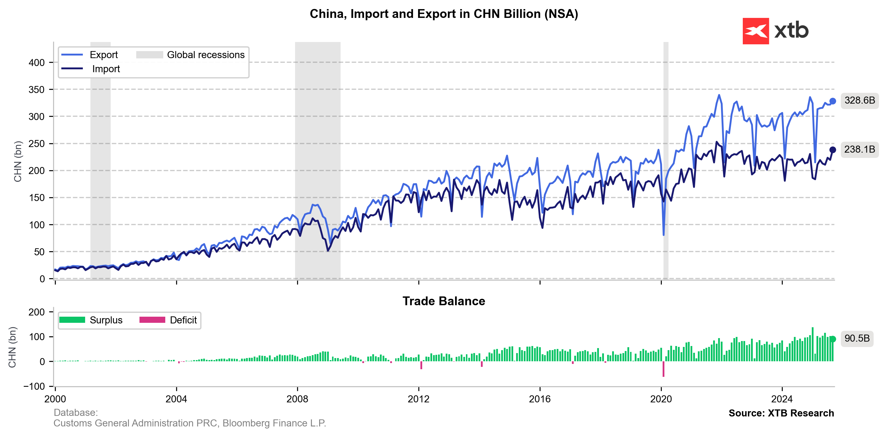 - Nadwyżka handlowa wyniosła 90,5 mld USD, nieco poniżej oczekiwań z powodu silnego importu.