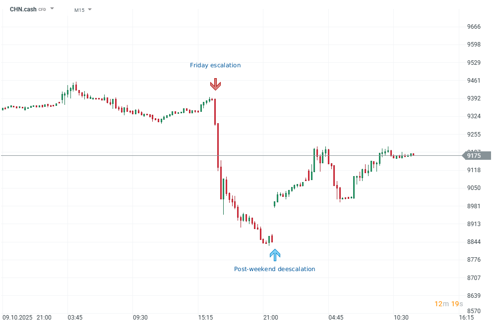 Pod koniec weekendu nastąpiła lekka deeskalacja po wpisie Donalda Trumpa, który zapewniał, że USA dojdzie do porozumienia z Chinami, a wojna handlowa nie jest korzystna dla żadnej ze stron. Rynki nadal liczą na ewentualne spotkanie Xi–Trumpa podczas APEC pod koniec miesiąca, jednak zakres możliwych scenariuszy się poszerzył. W krótkim terminie wzrost eksportu do rynków poza USA, gromadzenie zapasów surowców (stal, węgiel, soja z Ameryki Południowej) i przekierowanie handlu przez huby takie jak Wietnam łagodzą skutki napięć — jednak potrójne taryfy USA byłyby silnym szokiem deflacyjnym dla chińskiego sektora eksportowego i ciosem dla globalnych rynków ryzyka.