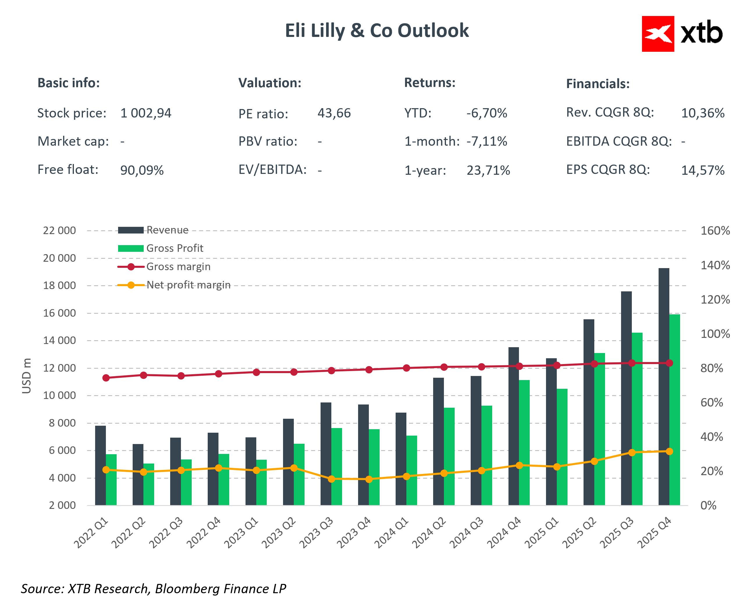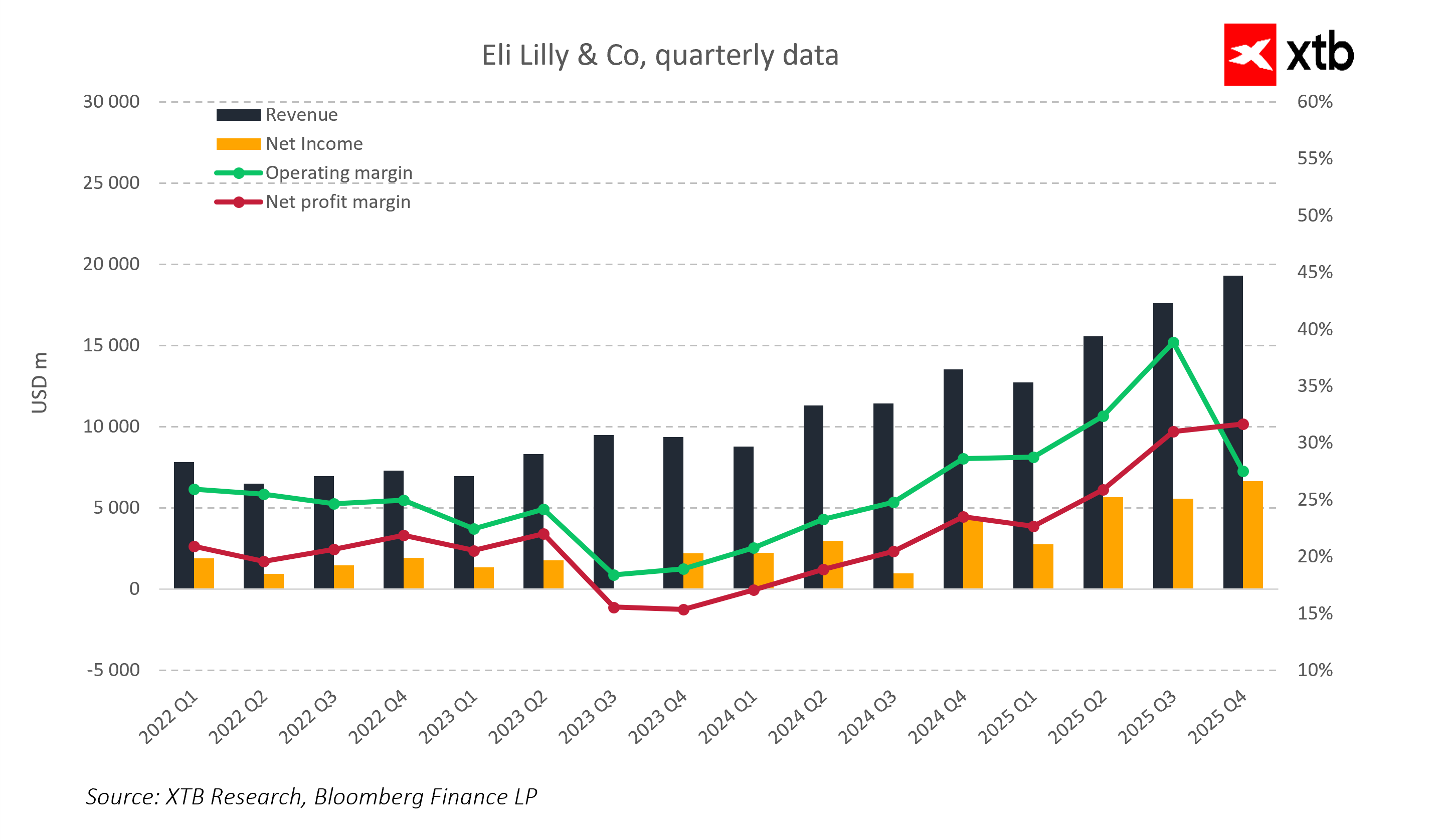 Gigant sektora farmaceutycznego Eli Lilly (LLY.US) znany przede wszystkim z leków na cukrzycę i otyłość przedstawił świetne wyniki za Q4 2025 - napędzane 46% wzrostem r/r wolumenów sprzedaży. Akcje spółki rosną ponad 7% przed otwarciem Wall Street i prawdopodobnie wzrosną dziś w pobliże rekordowych poziomów w historii.