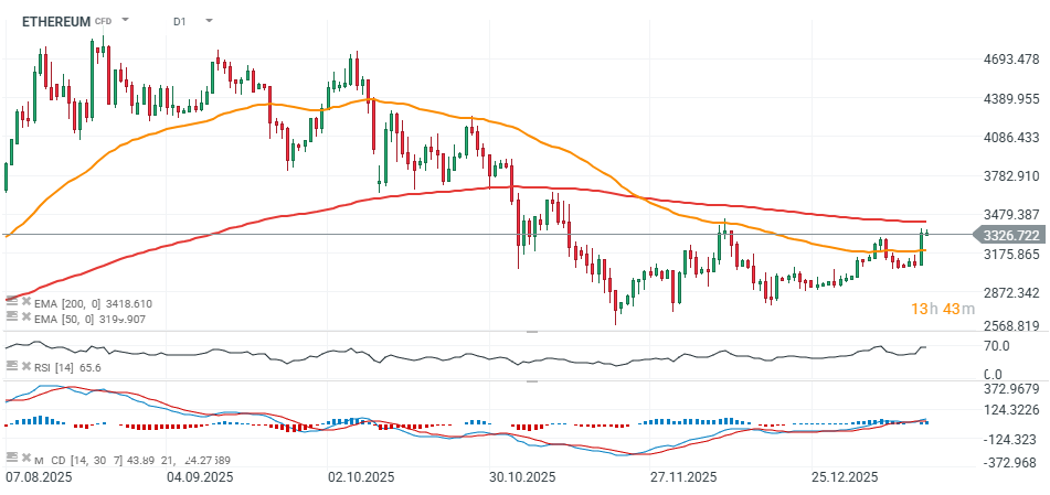 Po tym jak cena Bitcoina wzrosła do ponad 95 tys. USD, także druga największa kryptowaluta - Ethereum dołączyła do wzrostów, odbijajac do najwyżśzego poziomu od miesiąca. W dniu 15 stycznia (środa), akcjonariusze największego na świecie holdingu Ethereum, prowadzonego przez znanego z Fundstrat, Toma Lee, BitMine immersion Technologies (ok. 3,5% dostępnej podaży ETH) będą głosować nad olbrzymią emisją akcji, która zostanie wykorzystana na zakup kolejnych Etherów na rynku. Jeśli akcjonariusze wyrażą zgodę, za czym staje Lee, możemy oczekiwać bardzo dużego kupca na rynku Ethereum, co w warunkach potencjalnego odbicia Bitcoina może skutkować próbą powrotu do trendu wzrostowego.