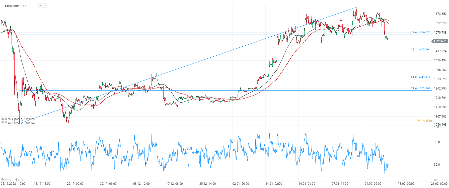 Cena Ethereum spadła poniżej 100 i 200 sesyjnej średniej kroczącej tworząc tzw. krzyż śmierci na interwale godzinowym. RSI ochłodziło się i wynosi 27 pkt. sygnalizując poziom wyprzedania. Po spadku poniżej 71,6 zniesienia Fibonacciego fali wzrostowej rozpoczętej w listopadzie 2022 roku, kolejnym oporem może okazać się poziom 61,8 w okolicach 1460 USD. Źródło: xStation5