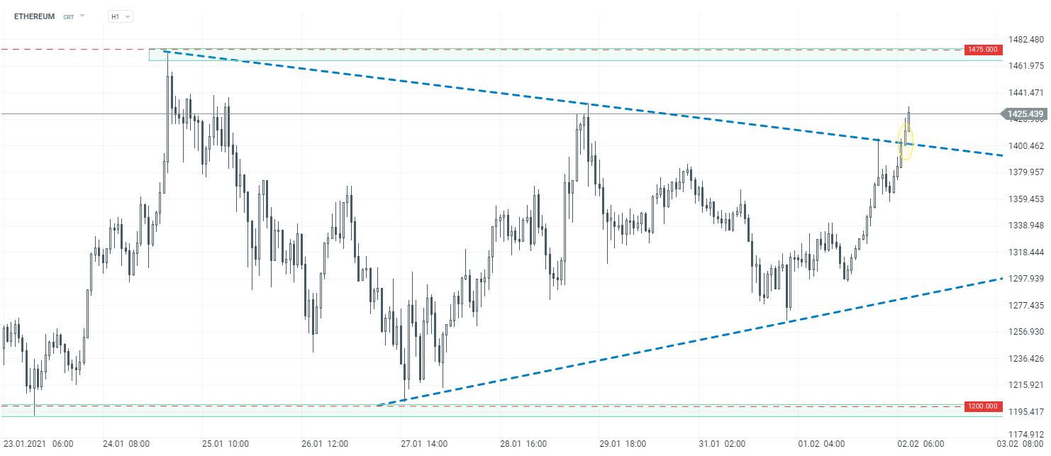 Podczas dzisiejszej sesji możemy obserwować ponad 5-cio procentowe wzrosty na Ethereum. Cena kryptowaluty ponownie zbliża się do historycznych maksimów (1475$), które zostały ustanowione 25 stycznia. Patrząc na wykres H1, doszło do wybicia z formacji trójkąta, co zgodnie z założeniami analizy technicznej przemawia za dalszym ruchem w górę. Czy kierunek wzrostowy zostanie utrzymany?